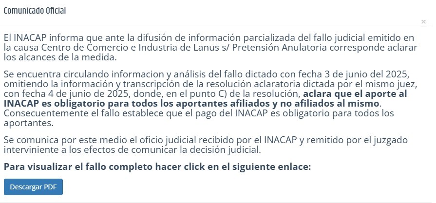 Ahora el INACAP comunica que “en el punto C) de la resolución, aclara que el aporte al INACAP es obligatorio para todos los aportantes afiliados y no afiliados al mismo. Consecuentemente el fallo establece que el pago del INACAP es obligatorio para todos los aportantes.”