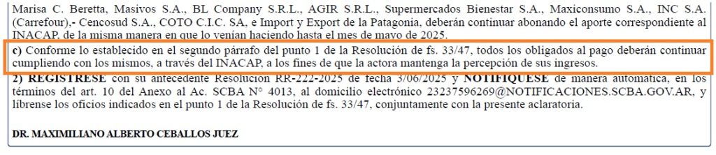 Sin embargo el punto c) COMPLETO establece que “c) Conforme lo establecido en el segundo párrafo del punto 1 de la Resolución de fs. 33/47, todos los obligados al pago deberán continuar cumpliendo con los mismos, a través del INACAP, a los fines de que la actora mantenga la percepción de sus ingresos”