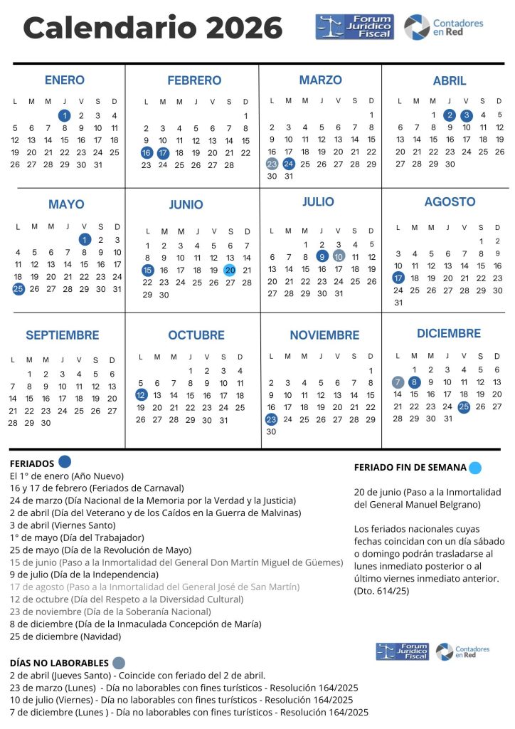 A través de la Resolución 164/25 se establecen como días no laborables con fines turísticos, las siguientes fechas para el año 2026: