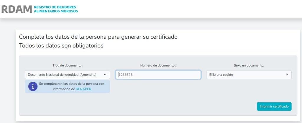 El sistema te pedirá que completes Tipo, Número de documento y Sexo que figura en el DNI de la persona que deseas consultar.