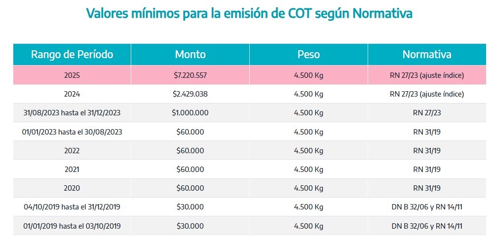 | Régimen General Bienes cuyo valor sea igual o superior a la suma de $7.220.557, o cuyo peso sea igual o superior a los 4.500 kg. (Ver tabla años anteriores) |