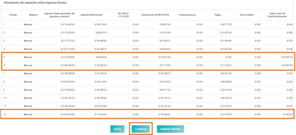 - Para corregir los montos de algún período del detalle mostrado en la tabla resumen del año fiscal deberá presentarse la declaración jurada rectificativa de dicho período.