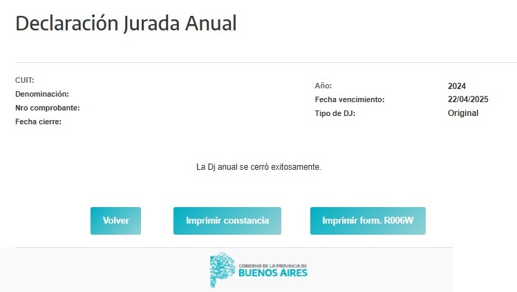 Al hacer clic en “Declarar” el sistema presenta la información y nos permite descargar la DDJJ Anual y su constancia de presentación.