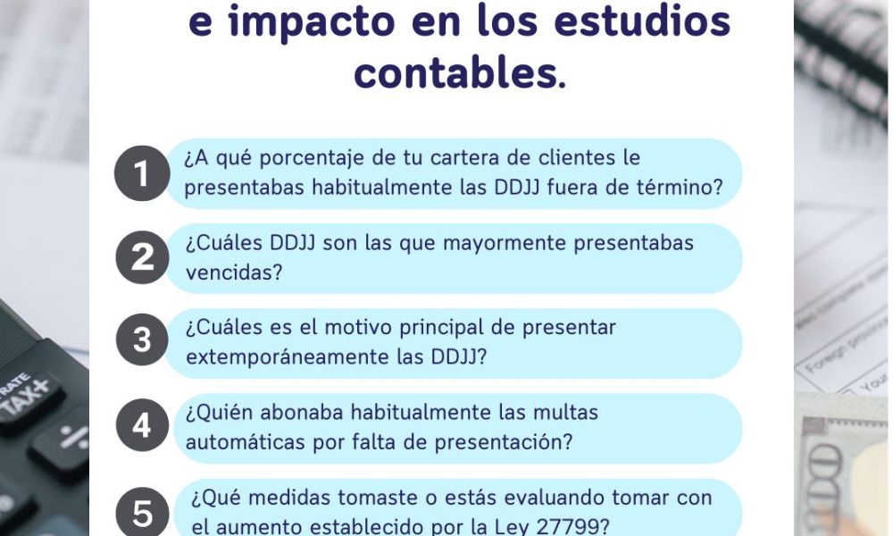 Esta encuesta releva cómo están viviendo esta situación los estudios contables en la práctica diaria: qué tipo de declaraciones juradas se presentan con mayor frecuencia fuera de término, cuáles son las causas reales de los atrasos, quién termina asumiendo el costo de las multas automáticas y qué decisiones están evaluando los profesionales frente al nuevo escenario sancionatorio.