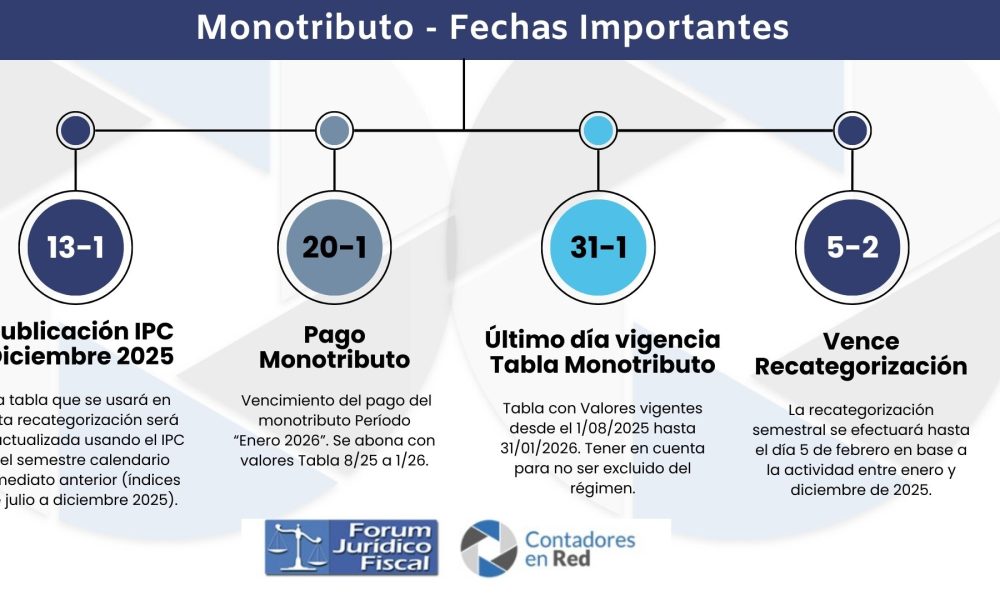 - 5-2-26 Vence Recategorización Monotributo: La recategorización semestral se efectuará hasta el día 5 de febrero en base a la actividad entre enero y diciembre de 2025.