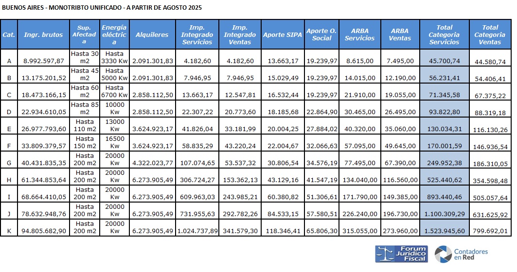 De esta manera la tabla de Monotributo unificado para provincia de Buenos Aires a partir de Agosto 2025 queda de la siguiente manera: