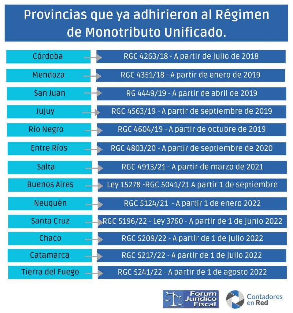 Actualmente hay 13 provincias que están adheridas al Monotributo Unificado que posibilita la opción de un Régimen Simplificado del Impuesto sobre los Ingresos Brutos para los contribuyentes monotributistas.