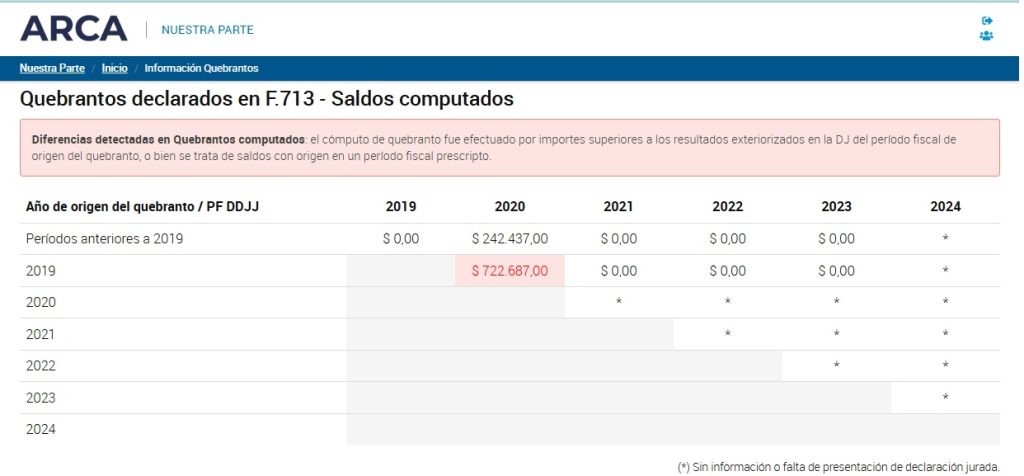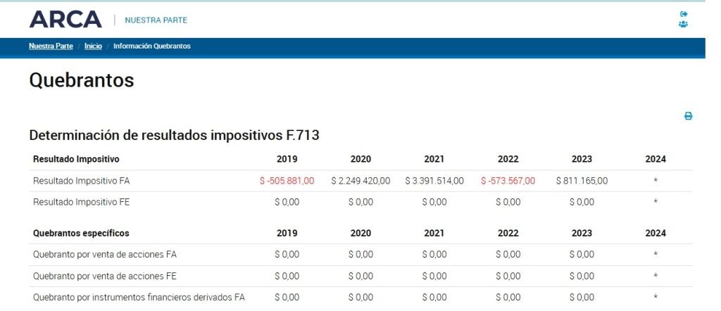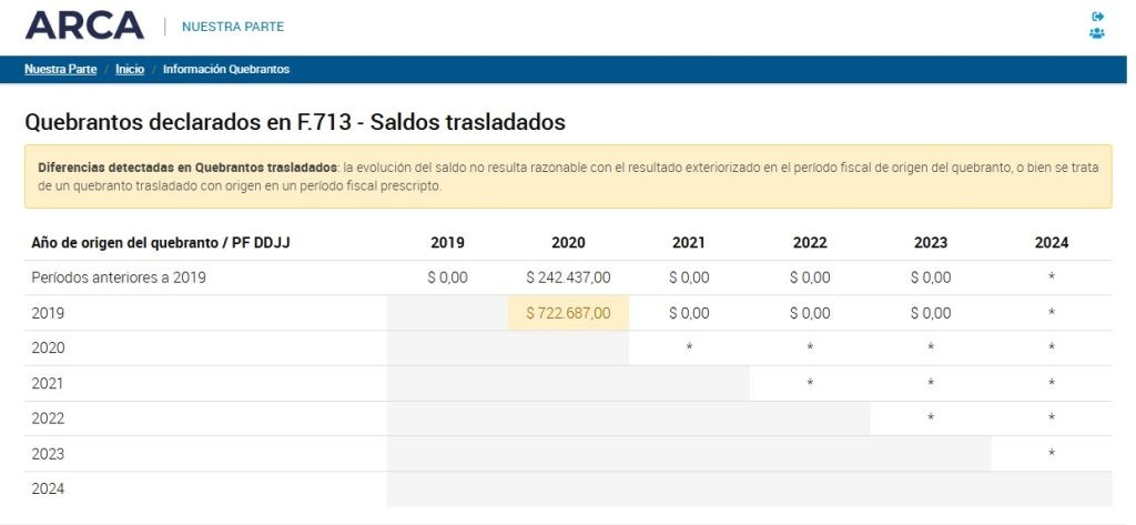 Hola yo tengo dos casos, lo que me di cuenta es que ARCA no actualiza los quebrantos y ahí tengo las inconsistencias, y según leí el articulo 25 LIG (ex art 19) dispone que los quebrantos de fuente argentina se actualizan por el índice de variación IPIM, yo los actualice, pero ahora no se como hacer para que ARCA reconozca esos montos.