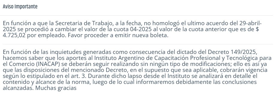 Incluso el, a punto de extinguirse INACAP, que había modificado el importe a abonar teniendo en cuenta los incrementos en el acuerdo ahora publica en su web: “En función a que la Secretaria de Trabajo, a la fecha, no homologó el ultimo acuerdo del 29-abril-2025 se procedió a cambiar el valor de la cuota 04-2025 al valor de la cuota anterior que es de $ 4.725,02 por empleado. Favor proceder a emitir nueva boleta”.