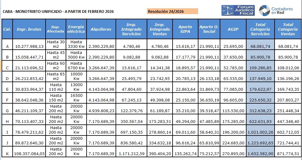 Tabla Monotributo Unificado CABA a partir de febrero 2026 – RESOLUCIÓN N.º 24/AGIP/26